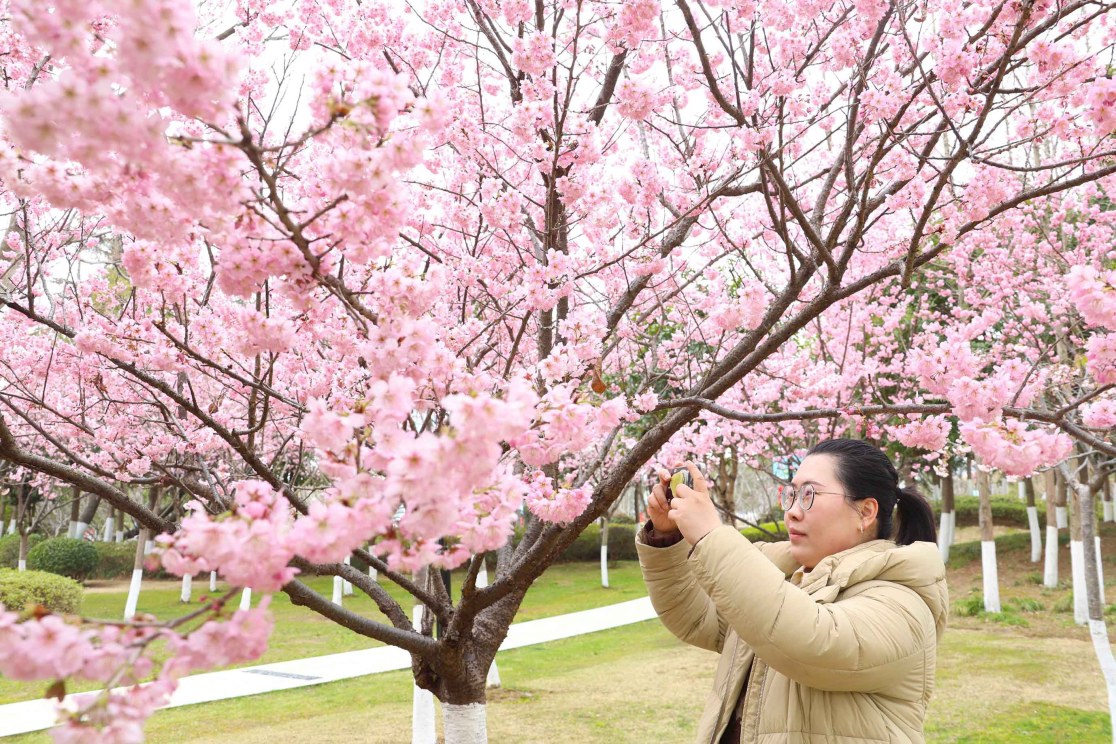 昨天,新城樱花公园内,30余株早樱绚丽绽放,吸引市民前来赏花游玩。