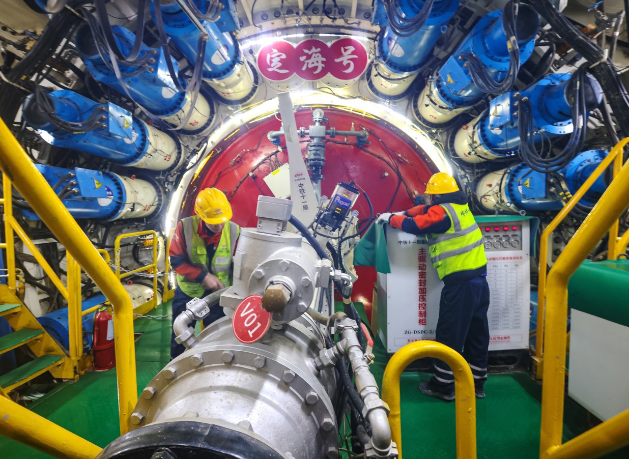 2月18日,甬舟铁路金塘海底隧道舟山侧盾构机作业面,“定海号”盾构机班组的工人在精心开展设备巡检保养 图/姚峰 周俊 陈星