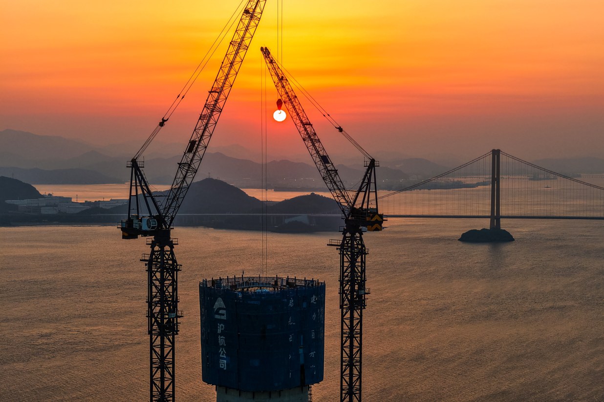2月18日,甬舟铁路西堠门公铁两用大桥施工现场,坚守的工人们迎着朝霞施工 图/姚峰