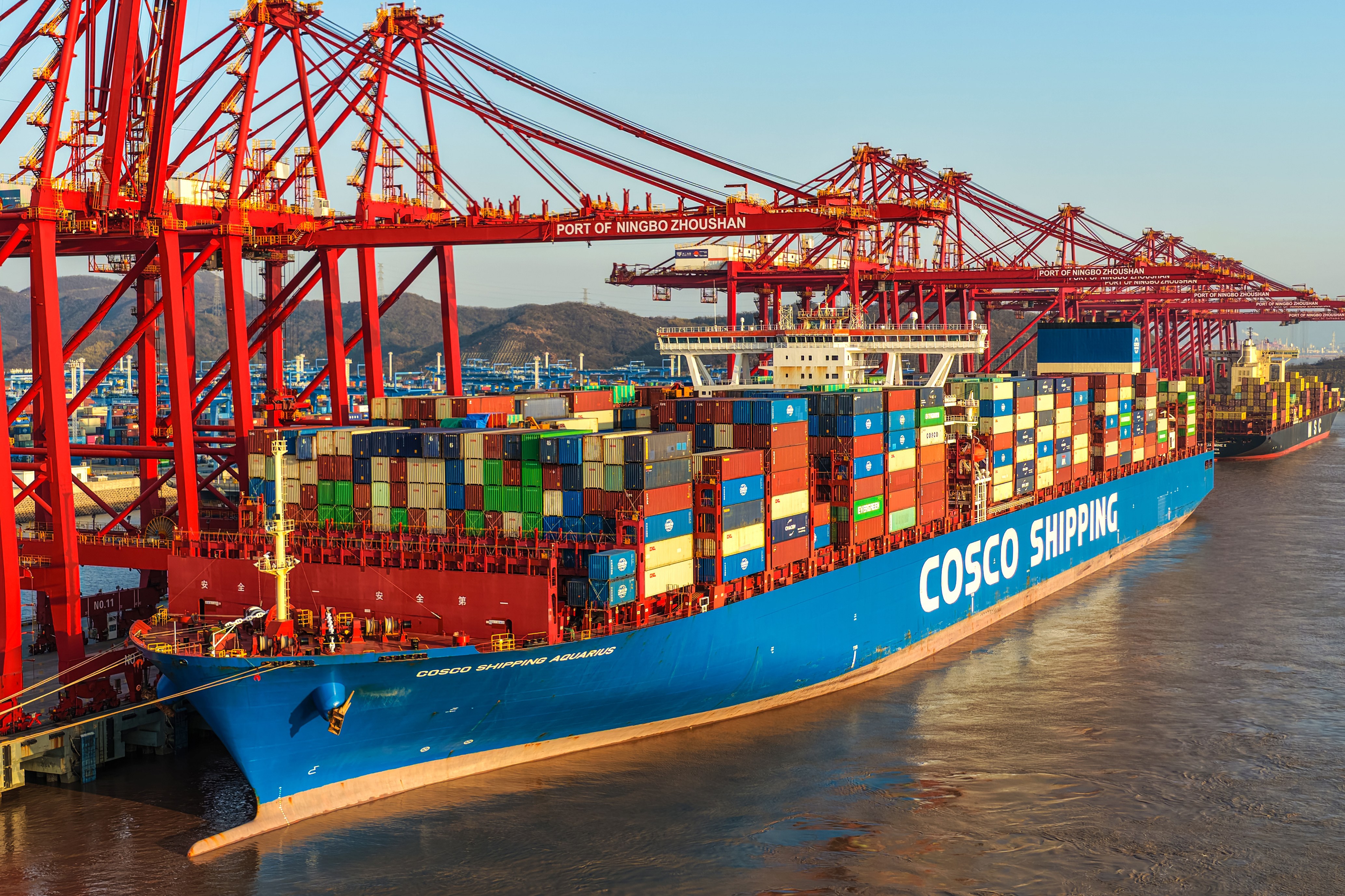2月20日,宁波舟山港金塘港区甬舟集装箱码头,两艘大型集装箱轮正在进行装卸作业 图/姚峰 吴桐