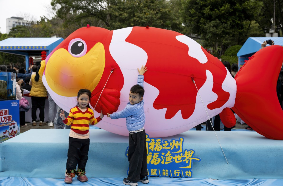 2月25日,在2026年“福州金鱼城市移动会客厅”活动现场,小朋友在充气卡通金鱼前打卡留影。