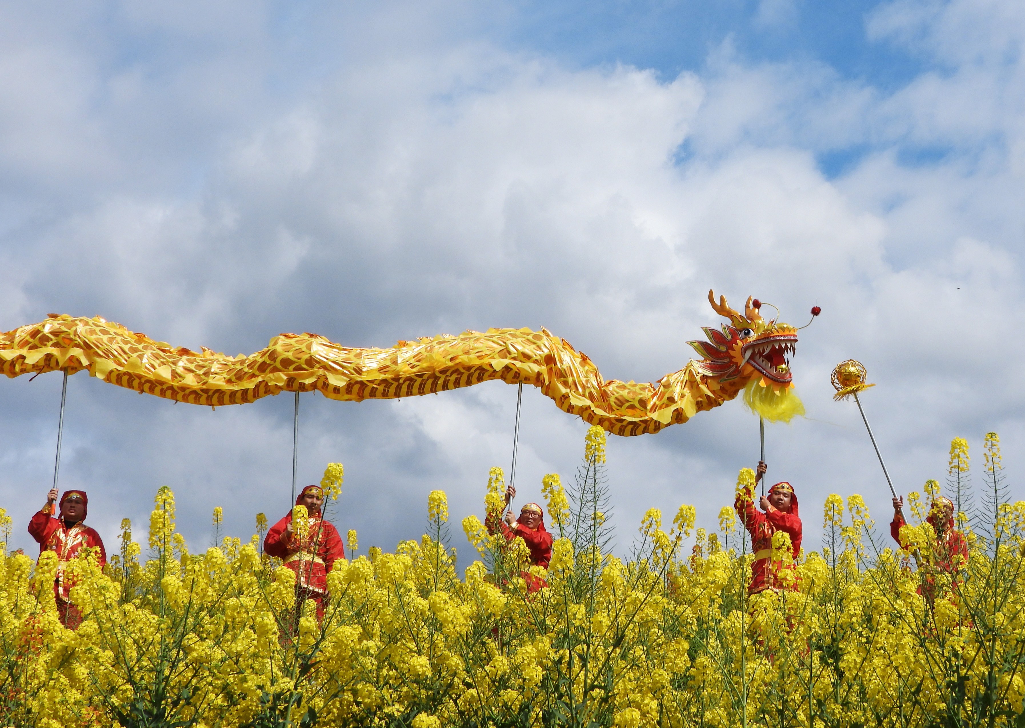 3月2日,人们在四川省达州市达川区龙会乡的油菜花田间表演舞龙。春暖花开,神州各地春意融融。人们纷纷来到户外踏青赏花,乐享春光。