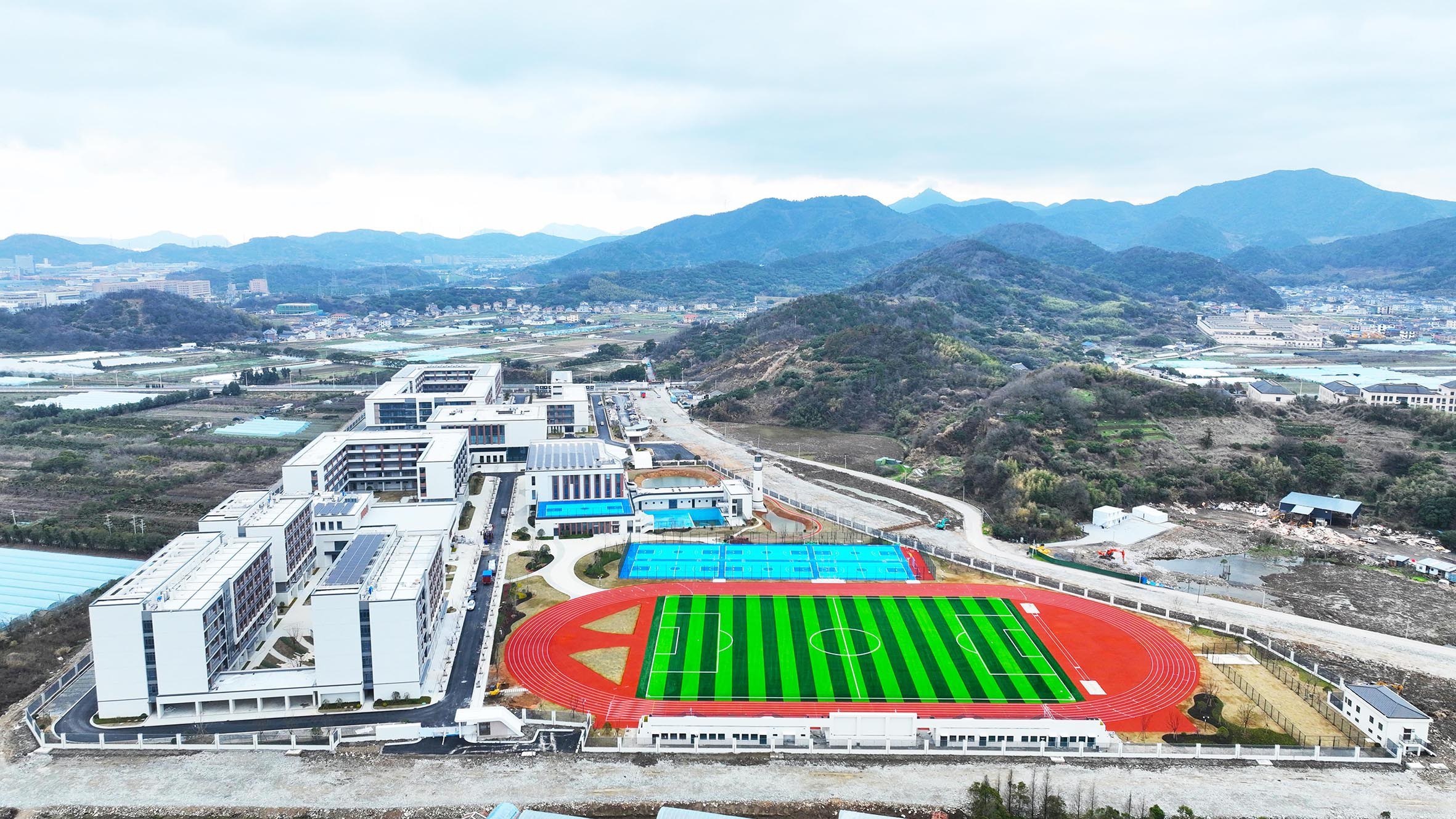 近日,位于定海区白泉镇北部的舟山高新区职业学校新建项目全面落成,即将验收交付。据了解,该项目工程总占地面积约11.5万平方米,设计招生规模为3540人,社会培训约300人,今年6月底,学校将正式启动招生,并在2026年秋季学期迎来首批新生。
