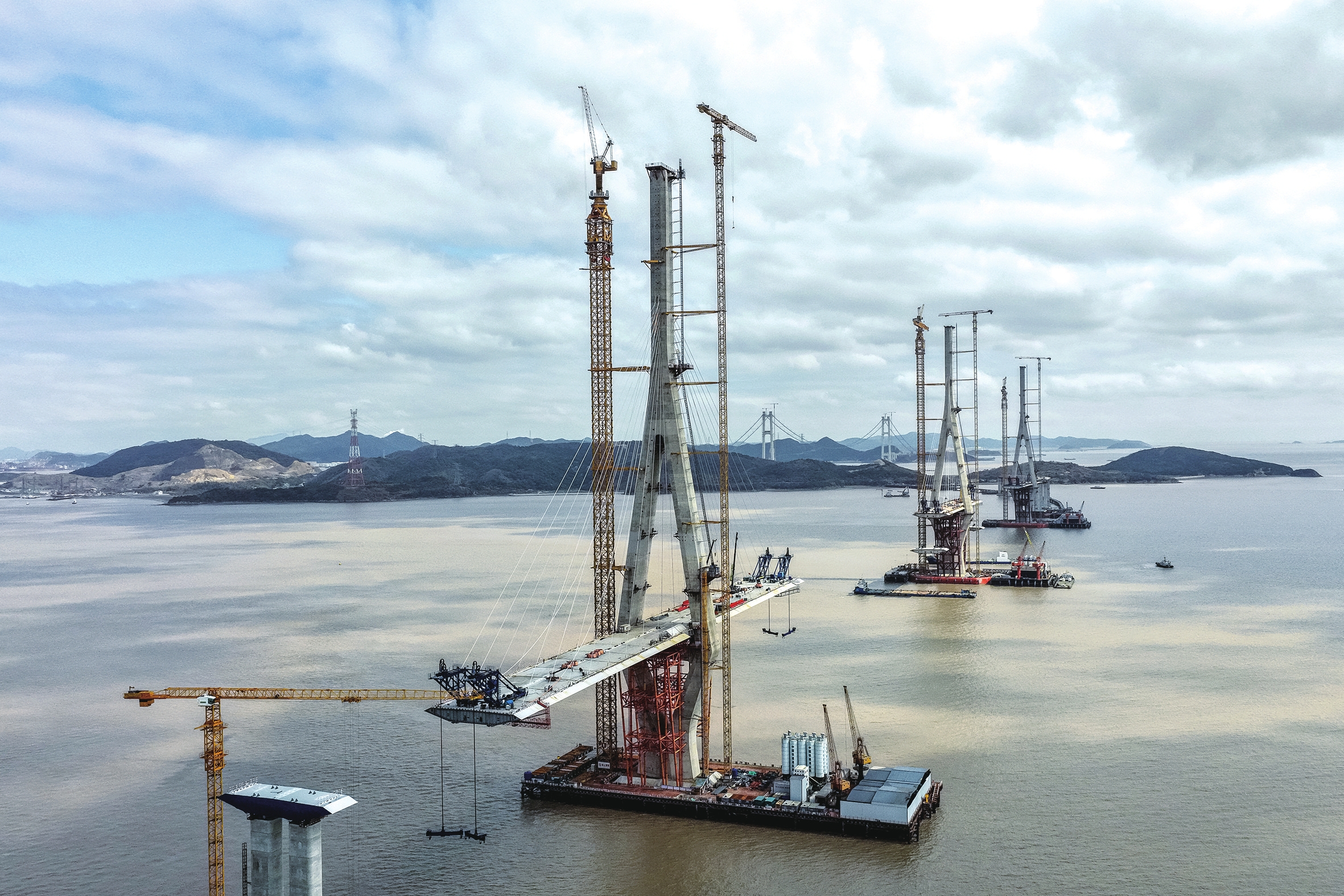 在建中的青龙门大桥三塔矗立,近日,Q4号主塔的两榀钢箱梁完成吊装。青龙门特大桥连接舟山佛渡岛与宁波梅山岛,是宁波舟山港六横公路大桥二期项目的关键控制性工程之一,全长5.864公里,其通航孔桥全长2212米,双主跨756米,是世界跨度最大的三塔钢箱梁斜拉桥,共需架设163榀钢箱梁,自去年11月15日首片钢箱梁成功架设以来,已架设钢箱梁67榀。