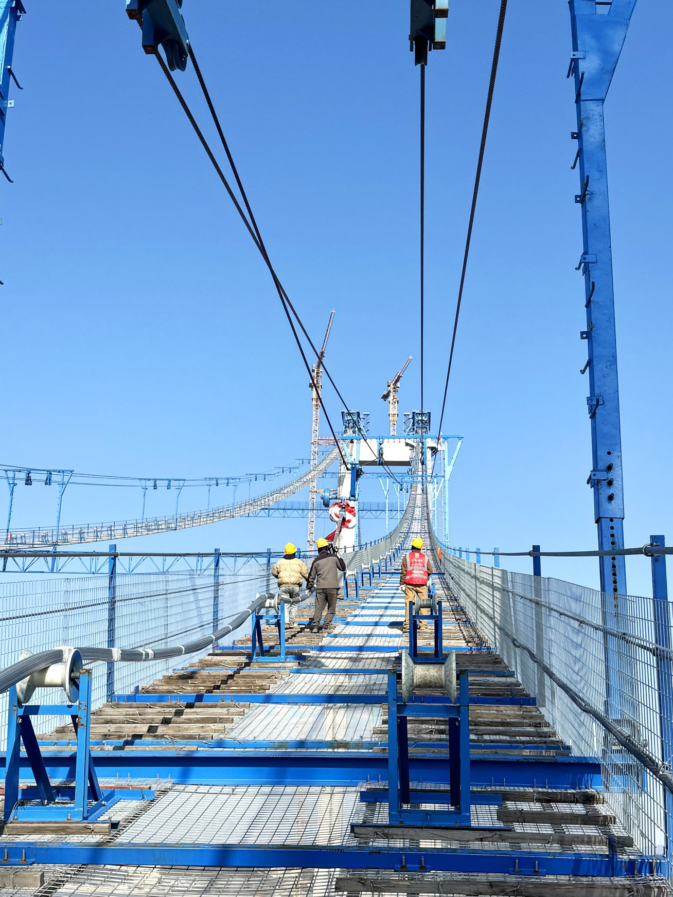 “单根索股高程偏差需控制在±88.4毫米之间,而为保障大桥后续线形长期稳定,左右幅2根基准索股相对高差需控制在10毫米以内。”二工区技术质量部部长翁明磊介绍,基准索股架设对精度的要求很高,其架设精度将直接影响后续所有索股的安装质量,关乎大桥整体结构安全、线形美观及通行性能。