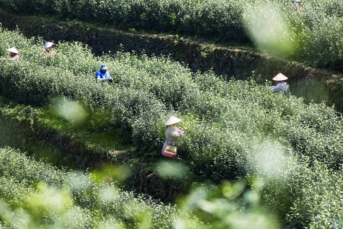 3月10日,在武义县更香有机茶园内,采茶工在采摘今年首批春茶。