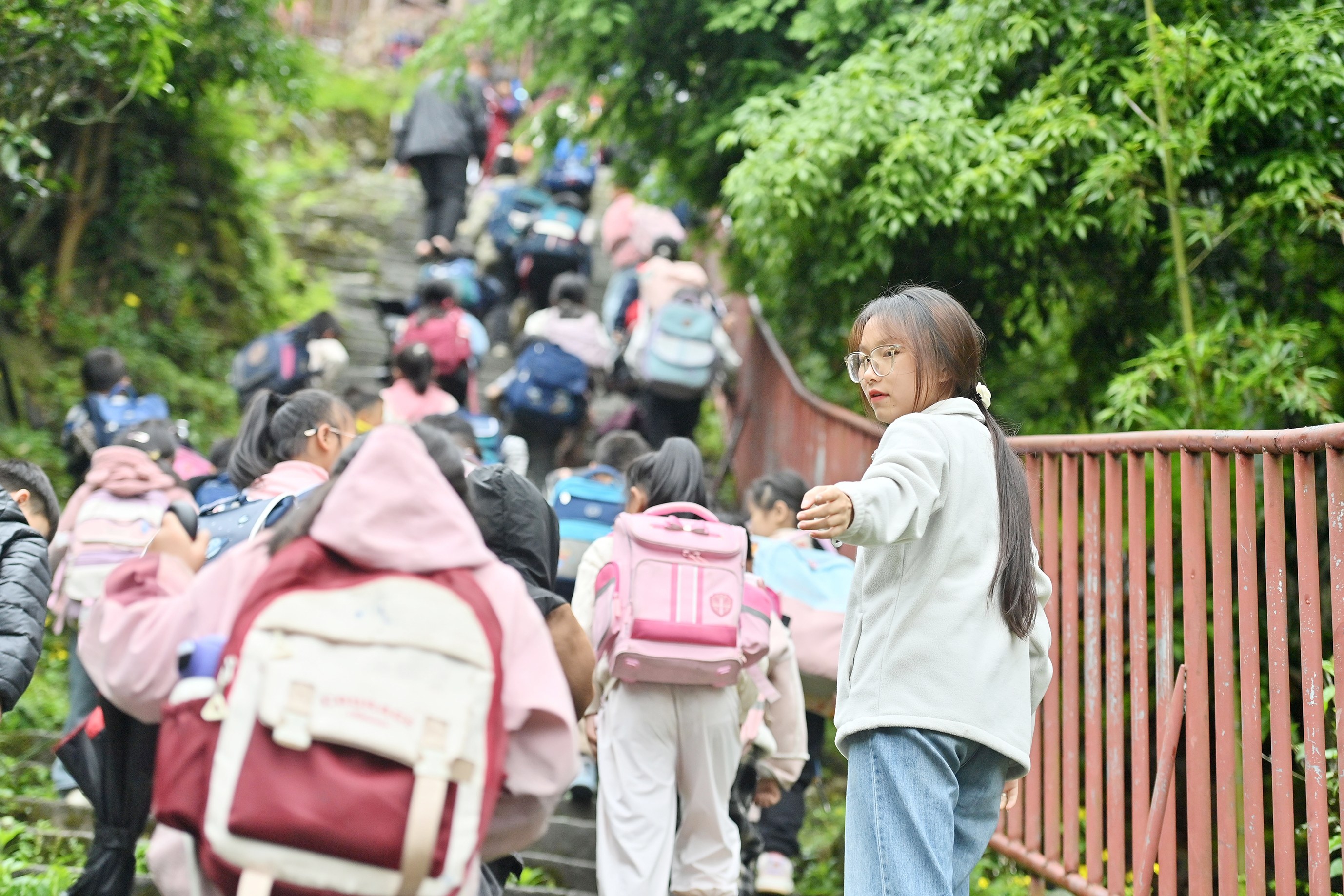 2025年4月30日,广西融水苗族自治县杆洞乡高培村小学校长梁巧(右)护送放学的孩子们回家。梁巧扎根大苗山深处,为乡村教育贡献力量。
