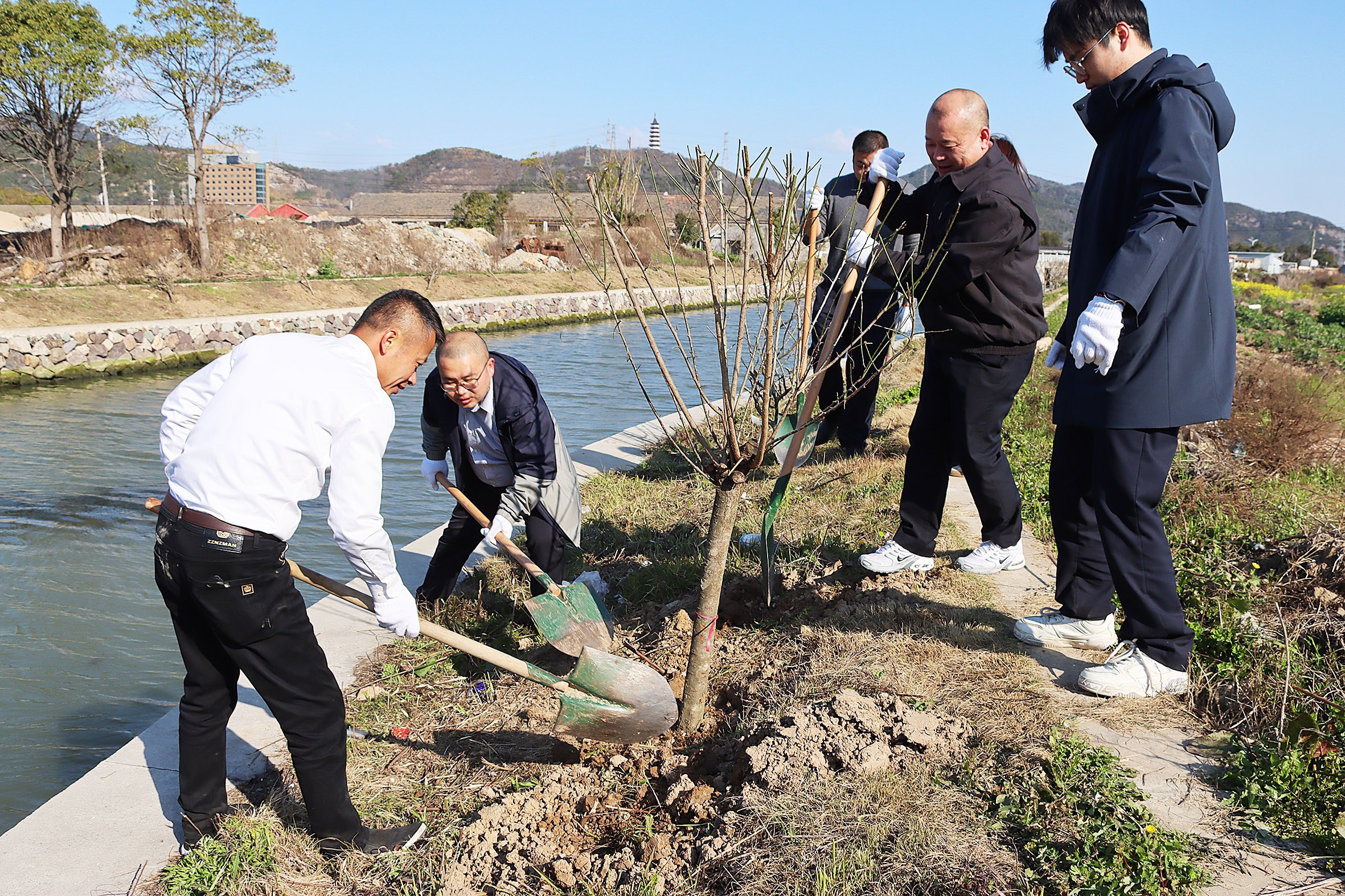 又到植树节。昨天上午,普陀区六横镇组织全镇干群、师生开展义务植树活动。在峧头凤舞河的河道两边,浙东交通投资发展有限公司的党员干部职工,挥锹铲泥,在一个多小时内栽种了70多棵海棠和梅花树。