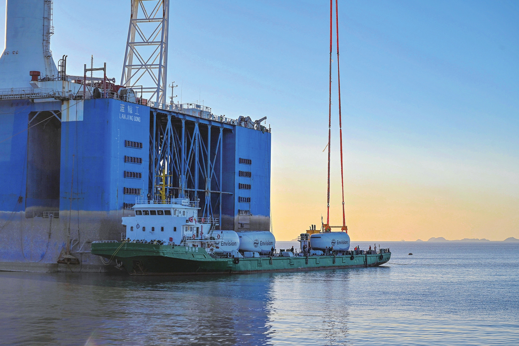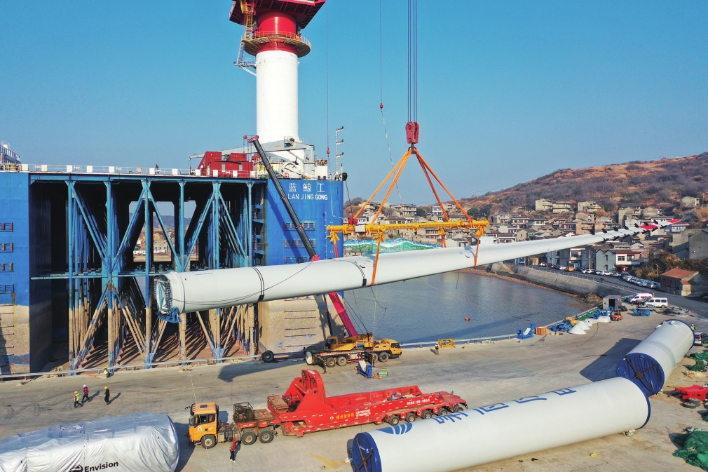 巨大的白色风机叶片被浮吊船上的起重机缓缓吊起,准备装车
