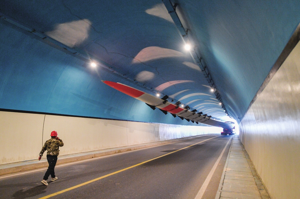 从衢山石子门渔港码头到山顶机位,“庞然大物”的运输与吊装环环紧扣:巨无霸半潜船“蓝鲸工”上吊机将风电机舱、塔筒等核心部件吊装上岸,90米的超长叶片在隧道内与崎岖山路上平稳转运,大型吊机将126吨重的机舱精准对接塔筒。每一个环节都凝聚着建设者的匠心,也彰显着项目推进的坚实步伐。
