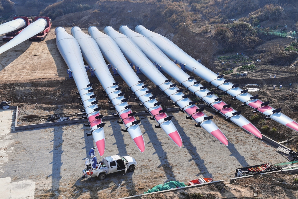 航拍视角下,多片叶片整齐地排列在临时堆场
