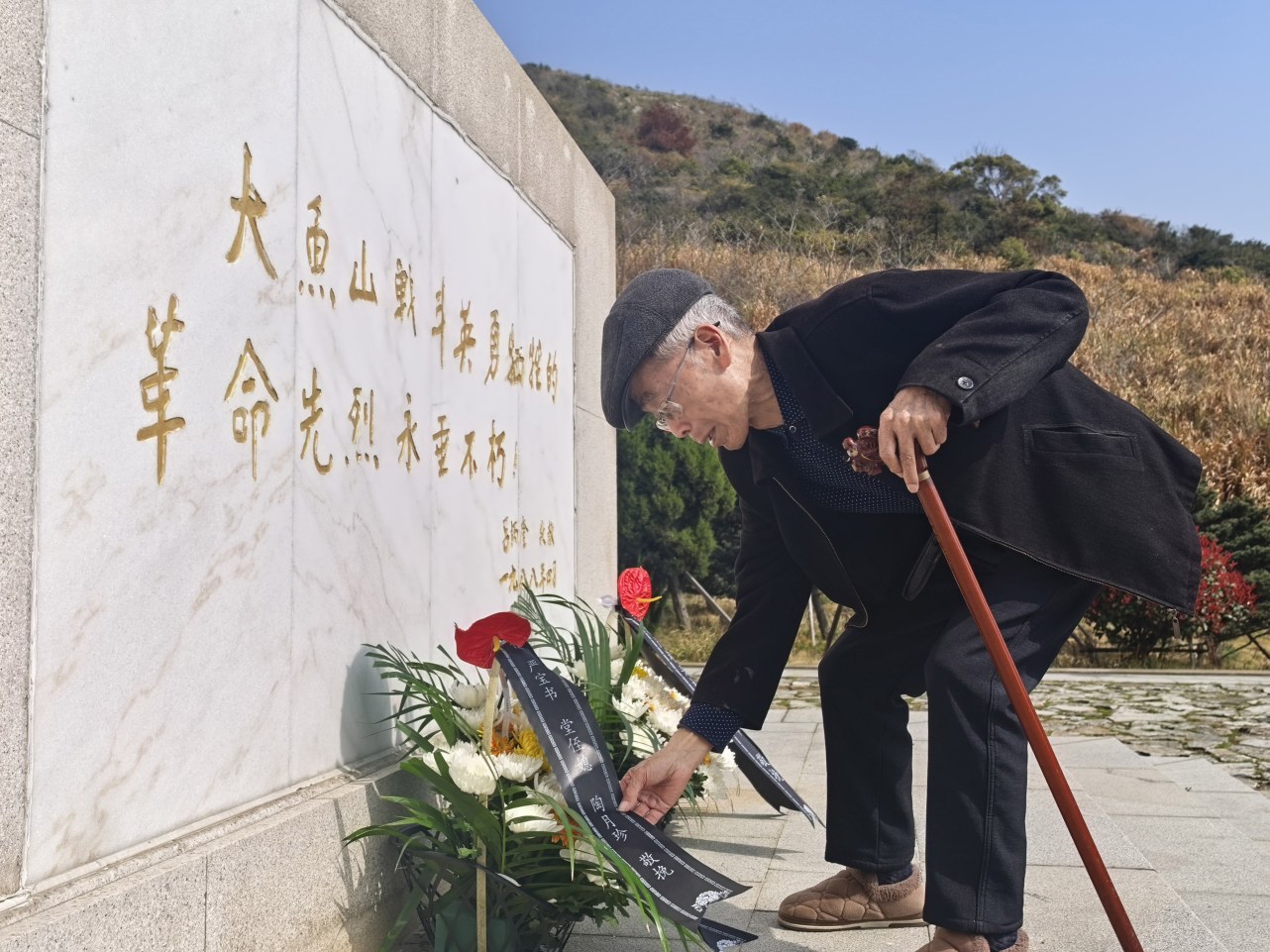 在鱼山岛革命烈士纪念碑前,严宝书等人献上鲜花,深情追思81年前那场气壮山河的血战(见图)。
