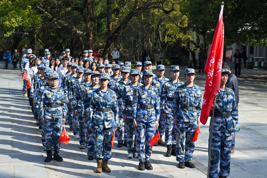 当天午后,海山公园入口处,《咱当兵的人》的雄壮旋律响彻云霄。60名退役军人身着军装,列队如松;60名军嫂身着蓝白相间的海魂衫,英姿飒爽;60名来自舟嵊小学的“军娃”身着统一校服,红领巾迎风飘扬。三个方阵带着对先烈的无限追思,踏着红色革命歌曲的铿锵节奏,整队步入烈士纪念广场。
