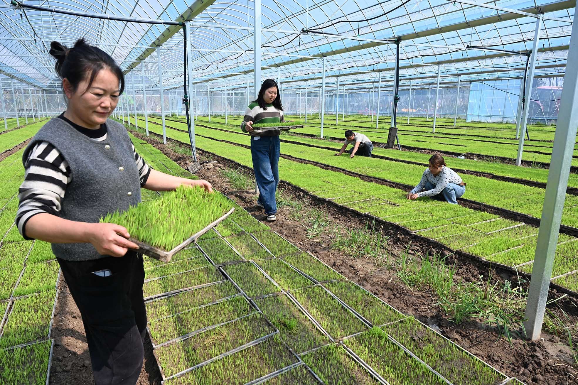 4月2日,普陀区六横晶利农业公司育苗场大棚内绿意葱茏,秧苗长势茁壮,工作人员正穿梭于整齐排列的育苗大棚间,抢抓春季育苗黄金期,小心翼翼地搬运、打理秧苗,为后续早稻插秧筑牢种苗基础。