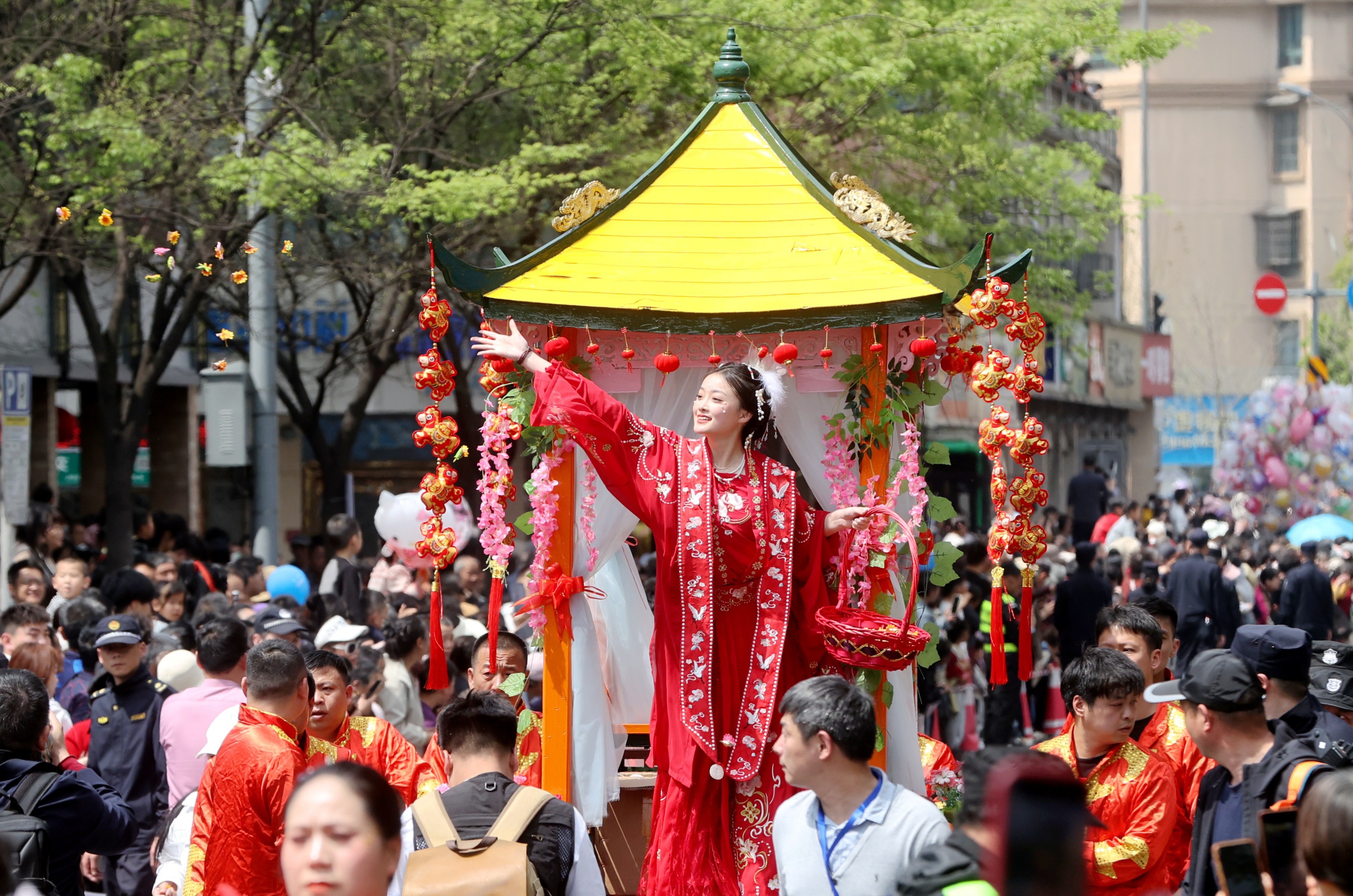 4月4日,在浙江省湖州市德清县新市古镇,“蚕花姑娘”向蚕农撒蚕花。