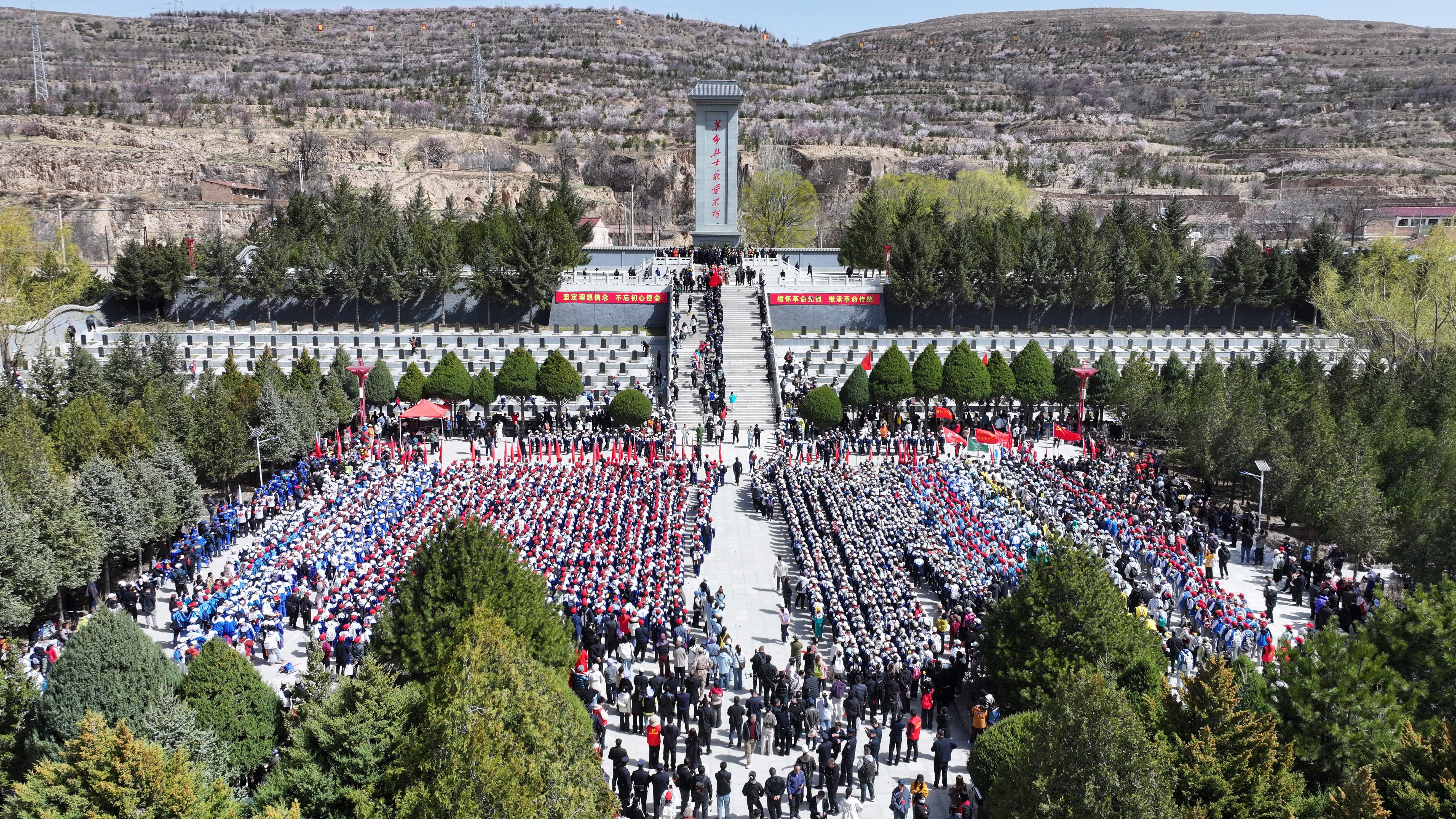 2026年4月3日,宁夏固原二中和弘文中学等学校师生及各界人士在位于彭阳县的任山河烈士陵园开展祭奠活动(无人机照片) 新华社记者 王鹏 摄