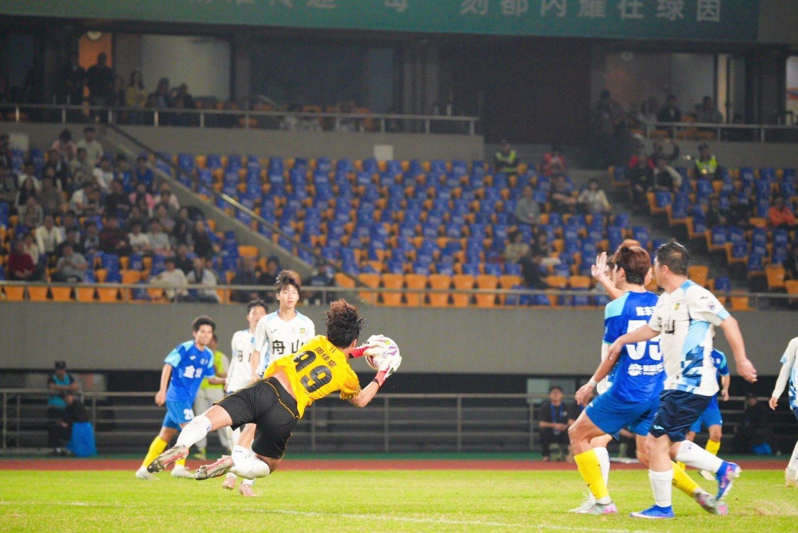昨晚,金华市体育中心热闹非凡,观众热情高涨,早早来到赛场为各自支持的队伍加油助威。随着裁判的哨音划破夜空,比赛开始,双方球员迅速进入状态,展开了激烈的争夺。面对金华队的猛攻,舟山队门将周佳宸多次扑救化解险情(见图),后卫队员也用他们的身体和意志筑起防线,但金华队以3∶0领先结束了上半场比赛。