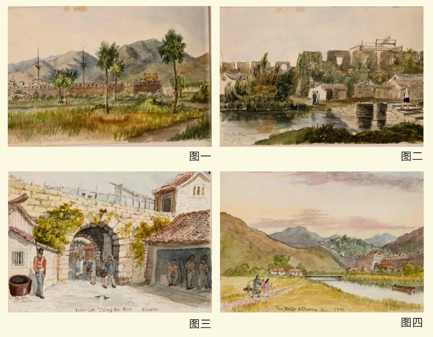 根据克里水彩画中的文字注释:图一绘于1840年9月7日,是定海县东门附近一段城墙远景。画中城墙前一条小路穿过草地,几棵又高又细的棕榈树矗立在草地上;城墙后耸立着高大的旗杆,远处丘陵连绵起伏。图二绘于1840年9月7日,为定海县东门城墙近景。画中城墙有护城河围绕,右侧有一座石砌小桥或防波堤伸入水中,中间地带分布着几幢建筑,远处是古老城墙,看似摇摇欲坠。图三描绘了舟山定海县内城墙,展现了鸦片战争期间作为古代防御工事的城墙的拱形石门。城门左侧是一名英军士兵,身着19世纪英国军服,肩扛步枪;城门右侧有三三两两的人群,肩挑货物进城;画面最右侧有几名英国士兵正在休息。城墙上长着常春藤,为古老的石墙增添了一丝绿意。图四描绘了1841年12月舟山城墙周边的乡村景象。画中一对夫妻走在乡村小路上,右侧小河映着天空柔和的色彩,营造出宁静的氛围;河岸边停着一艘船只,远处的城墙在连绵起伏的丘陵映衬下更显壮观。