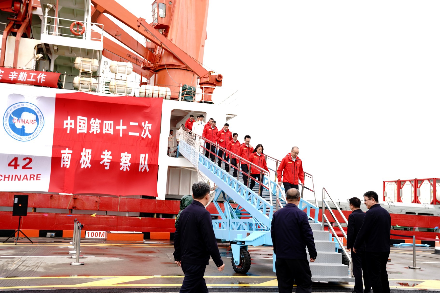 4月9日,中国第42次南极考察队队员走下“雪龙”号 新华社记者 张建松 摄