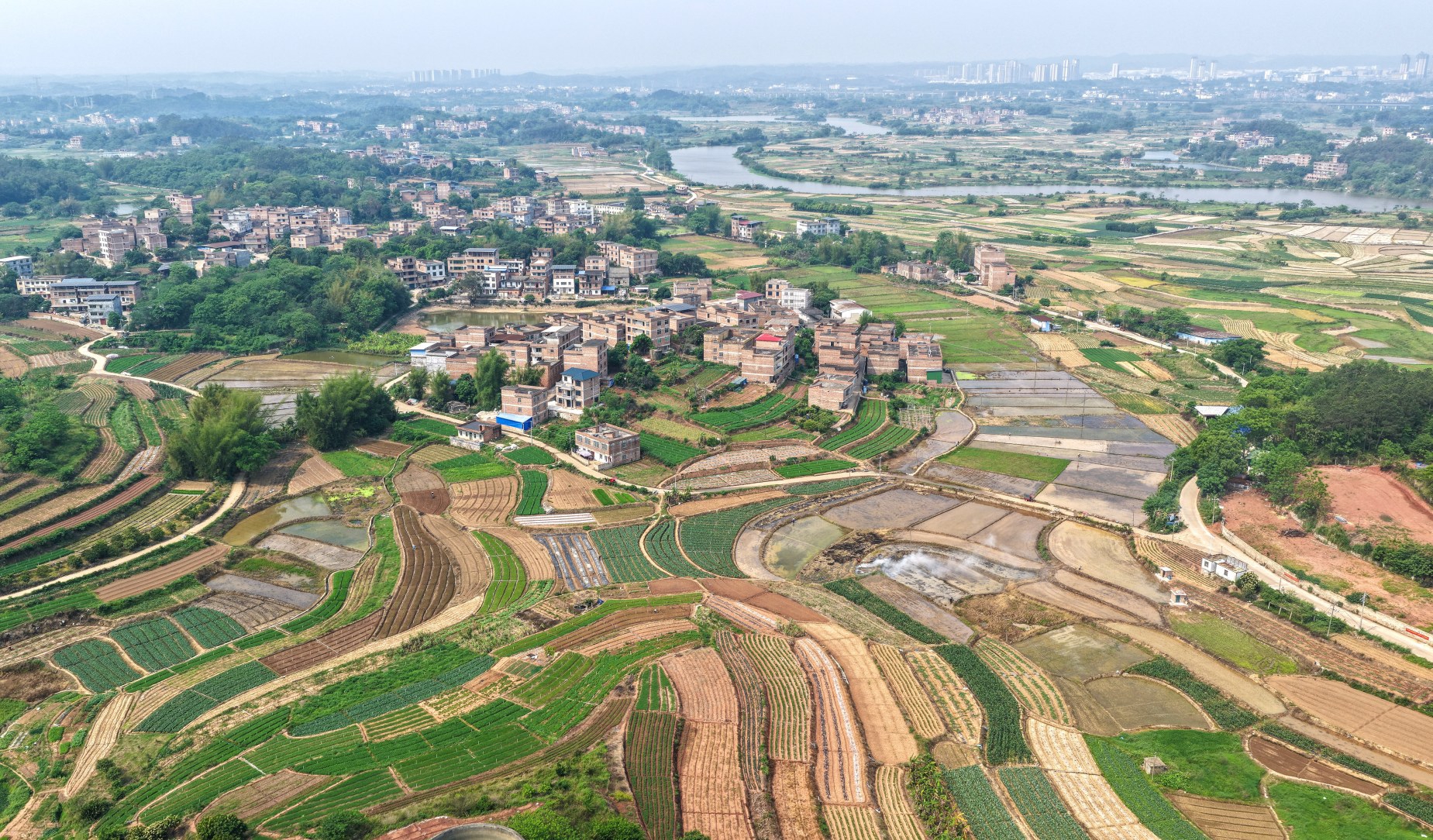 时下,广西南宁市邕宁区蒲庙镇田园色彩斑斓,与河流、村庄、山峦、道路相映成景,铺展出一幅生机勃勃的春日画卷。