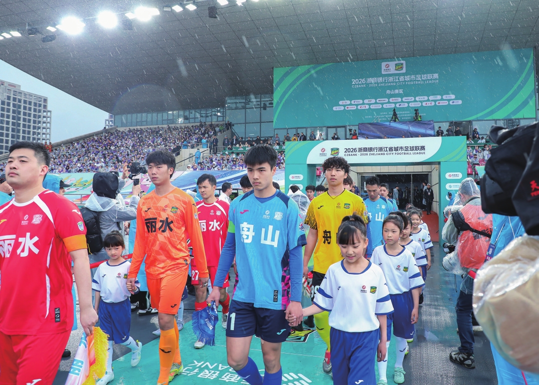 4月11日下午,舟山体育场,2026浙江省城市足球联赛(吴越杯)第二轮舟山队和丽水队的比赛在此举行,这是舟山队的首次主场赛。