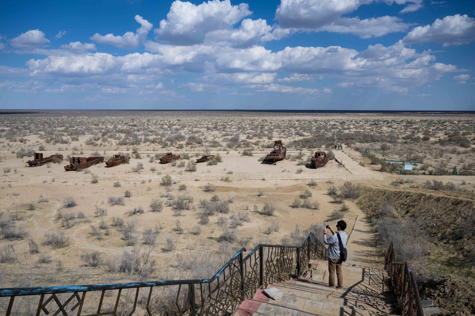 4月10日,在乌兹别克斯坦穆伊纳克,一名男子拍摄咸海“船舶公墓”。