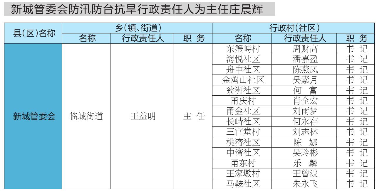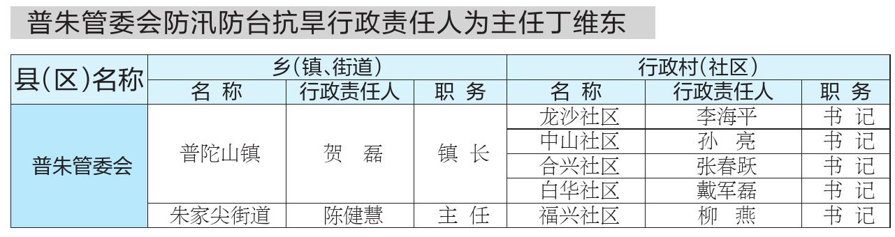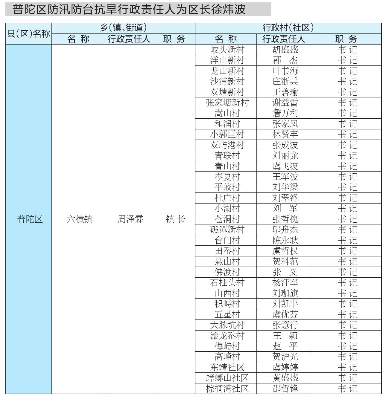 为切实落实全市防汛防台抗旱责任。根据《中华人民共和国突发事件应对法》、《浙江省防汛防台抗旱条例》等国家、省防汛防台相关法律法规,以及《舟山市人民政府防汛防旱防台指挥部工作规则》要求,现将全市2026年乡(镇、街道)和行政村(社区)防汛防台抗旱行政责任人、“县领导包乡”包保责任人名单予以公布,如遇部分人员调整,新任人员即为责任人。