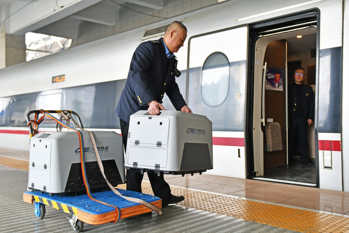 4月14日,在山东烟台站,工作人员将专用宠物运输箱转运至列车车厢。4月8日起,铁路部门推出“爱宠行”服务,提供“携宠出行”与“爱宠单独行”两种托运模式,更好地满足旅客多样化需求。