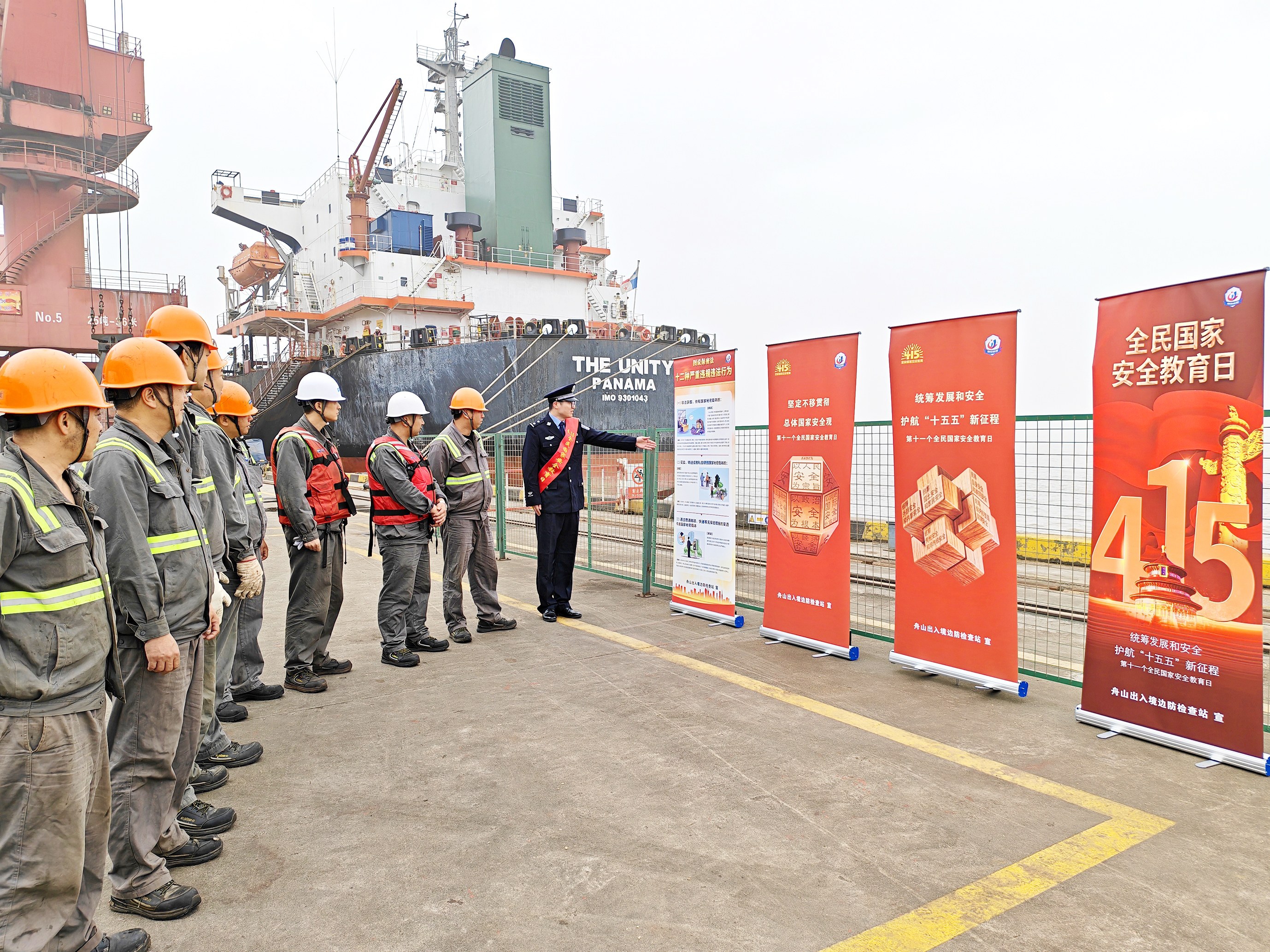 昨天是第11个全民国家安全教育日。当天,舟山边检站执勤五队民警深入舟山港老塘山港区一线,为码头作业工人、船员开展国家安全普法教育,共同筑牢国门安全线。