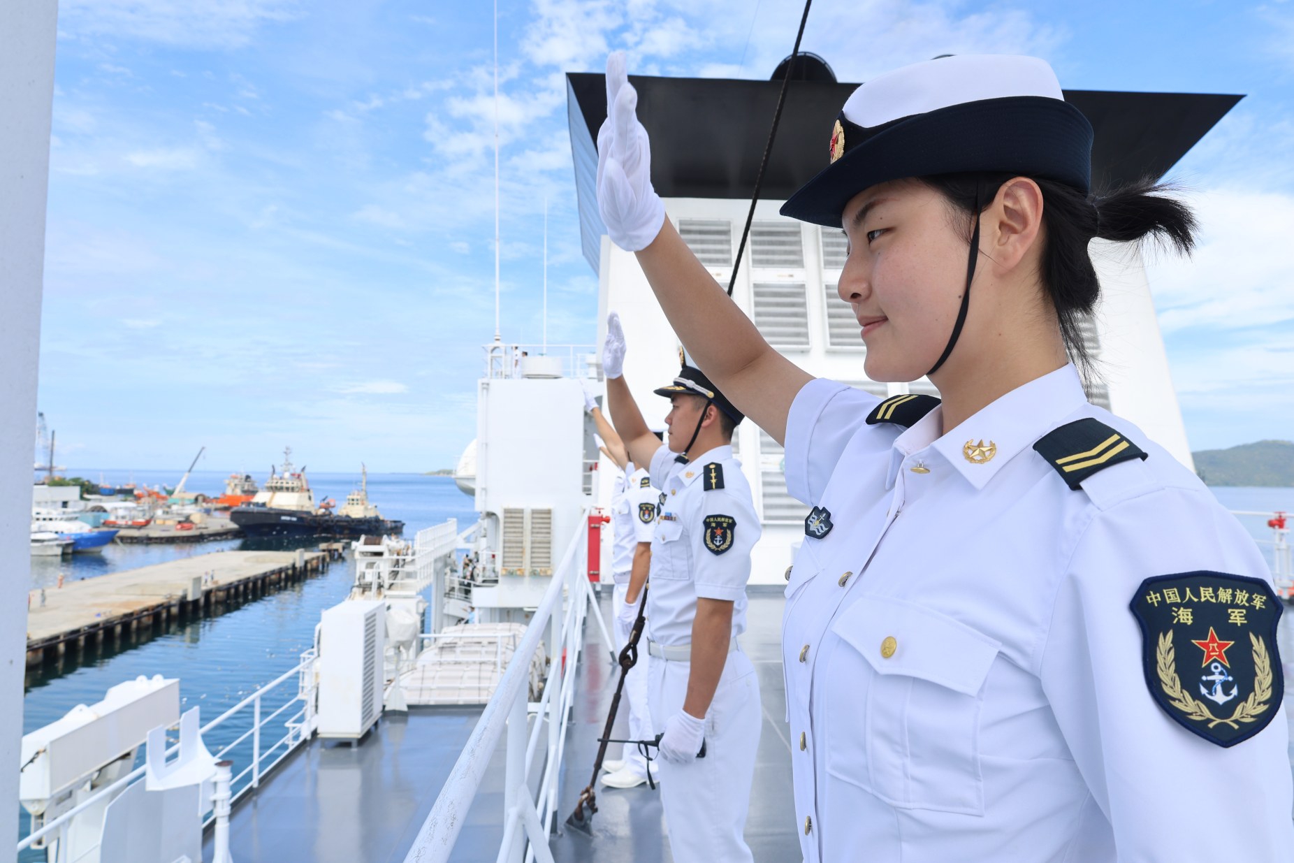 4月15日,执行“和谐使命-2025”任务的中国海军“丝路方舟”号医院船离开巴布亚新几内亚莫尔兹比港。这是医院船官兵分区列队。