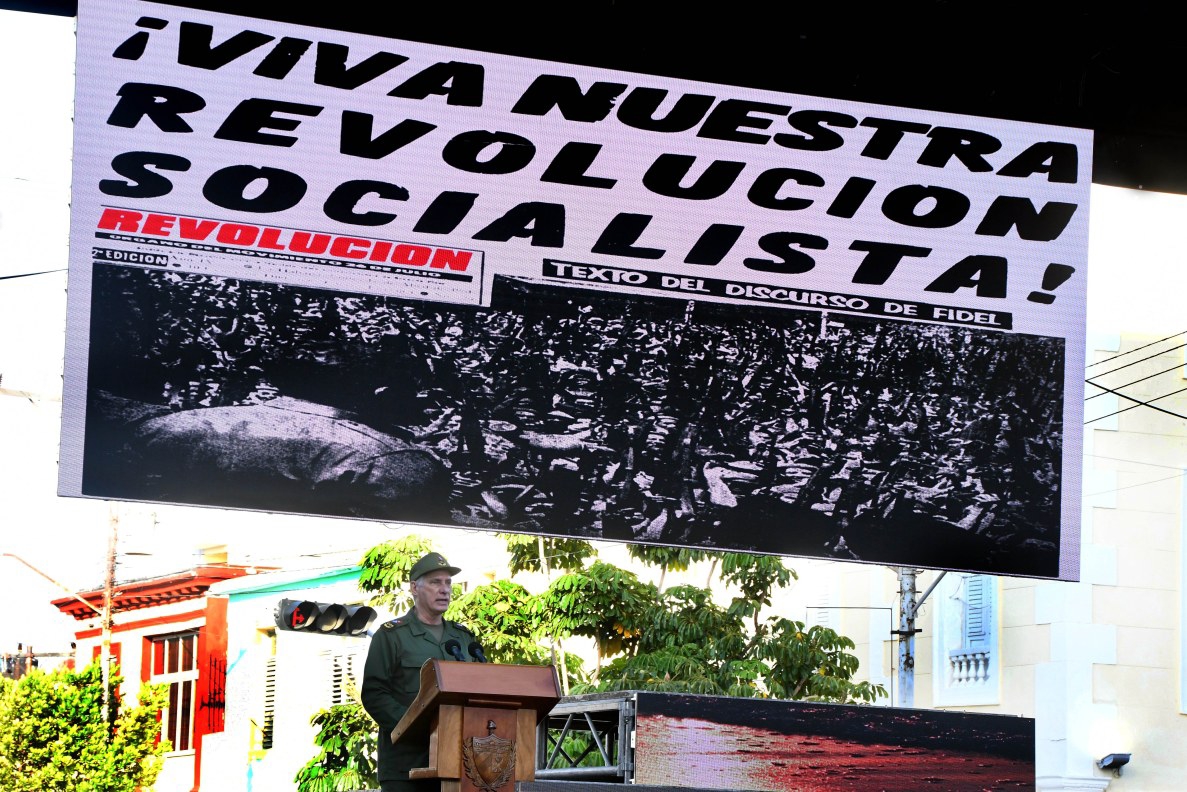 4月16日,在古巴首都哈瓦那,古共中央第一书记、古巴国家主席迪亚斯-卡内尔在纪念集会上发表讲话。