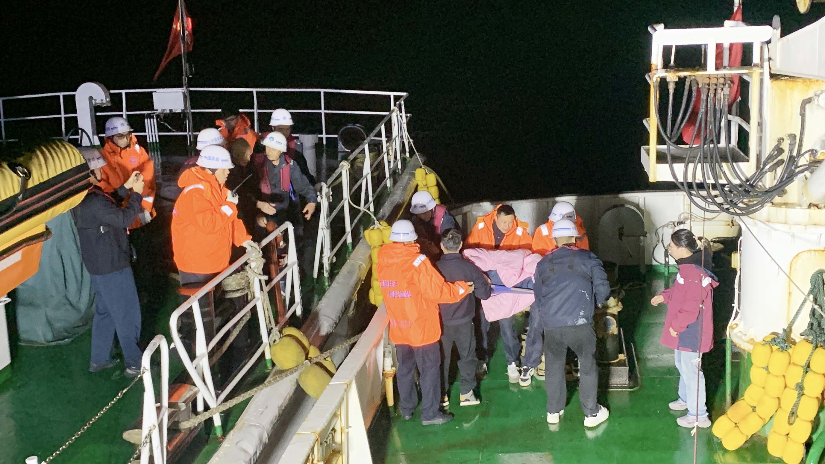 救援启动后,两艘公务船相继驶离各自所在港口,向着事发海域全速挺进。15日21时,中国海监7018船率先抵达目标海域,在起伏的海浪中稳稳靠近事发渔船。救援人员迅速将患病船员安全转移至海监船上。此时,病患船员右侧肢体已完全无法活动,病情十分危急。海监船又调转航向,全速返航。