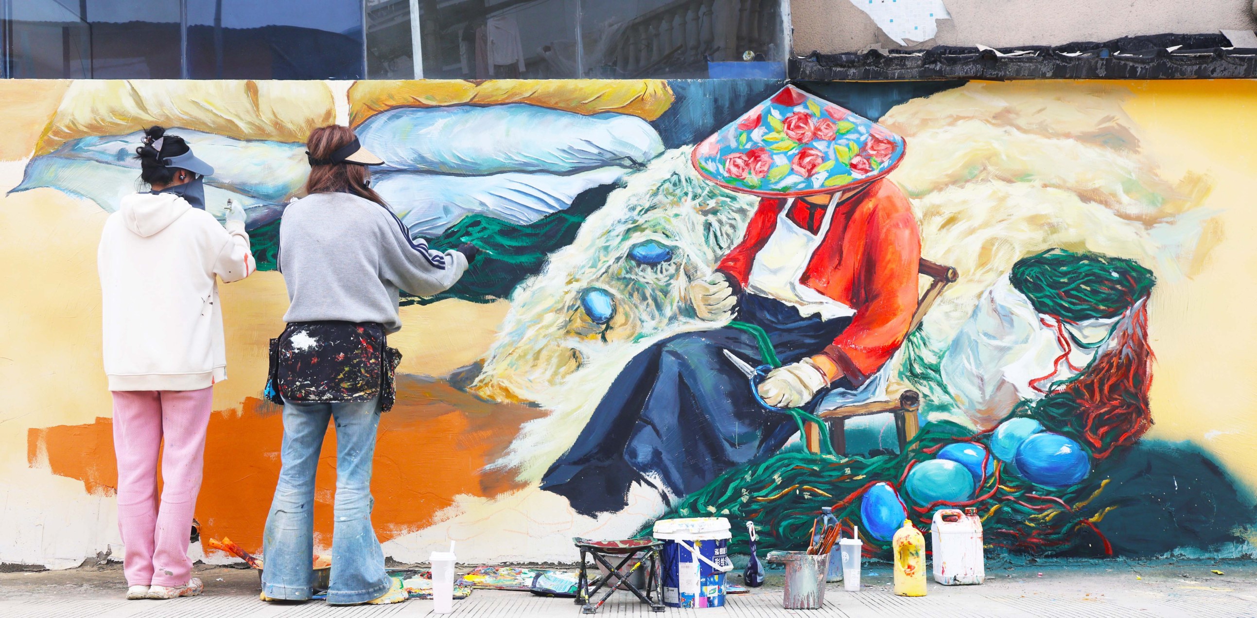 近日,朱家尖莲花村月岙,几名美术师正在600余米长的村道两侧创作渔村主题墙绘。据了解,此次墙绘创作共将打造15个景观点位,绘画总面积700余平方米,为海岛渔村增添别样韵味。