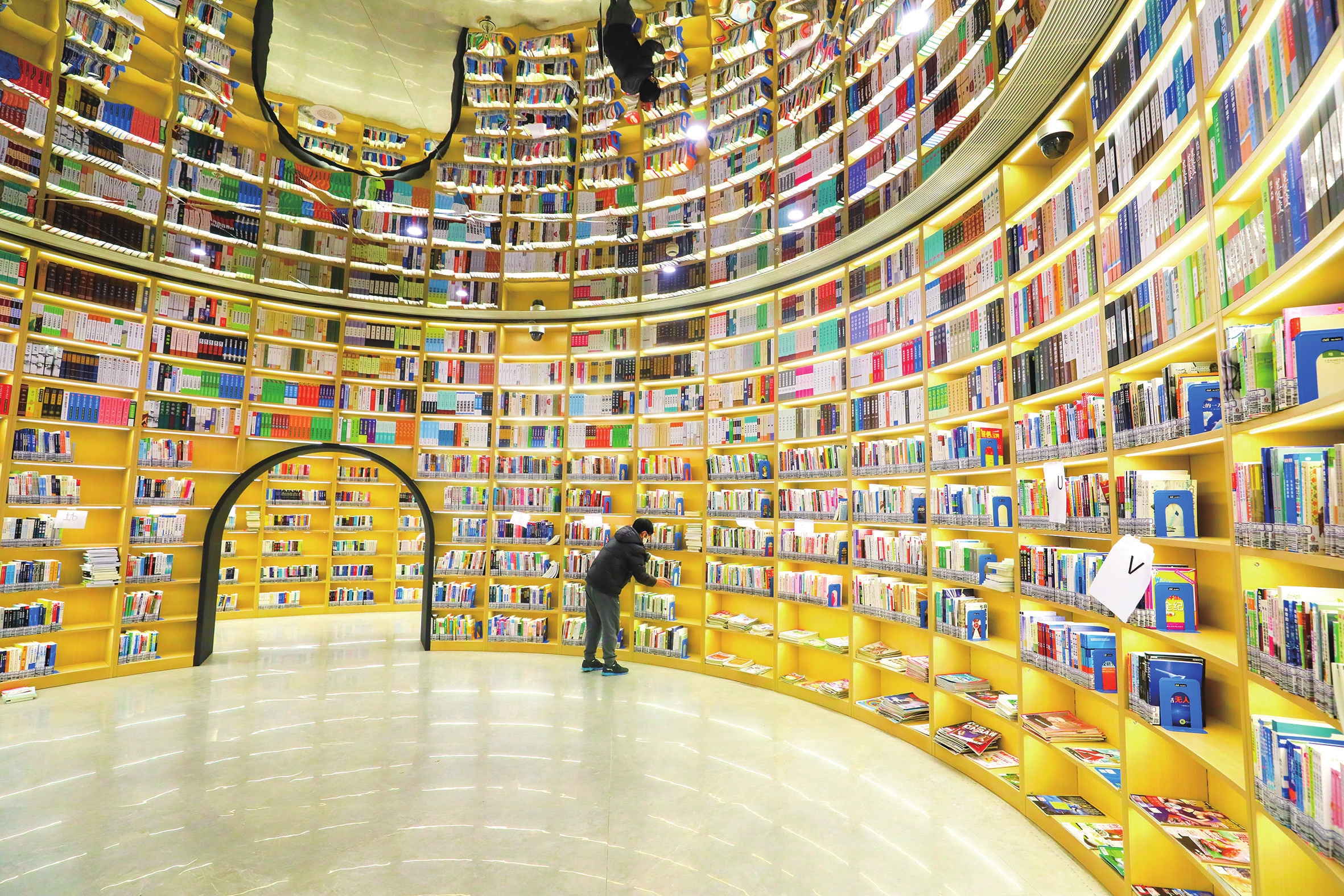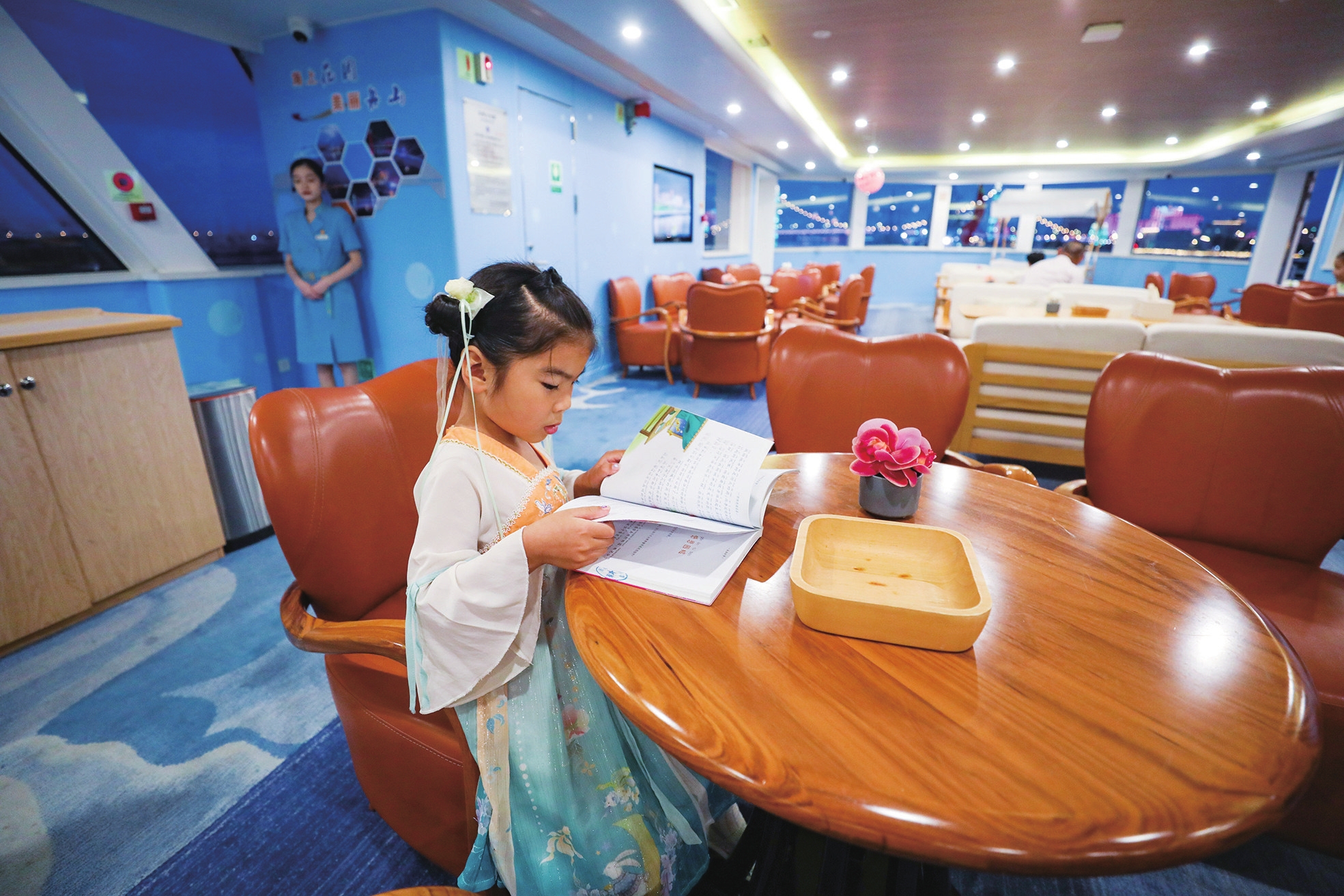 新城滨海湾夜游船设有岛屿书吧,一名小女孩看得津津有味 图/张磊