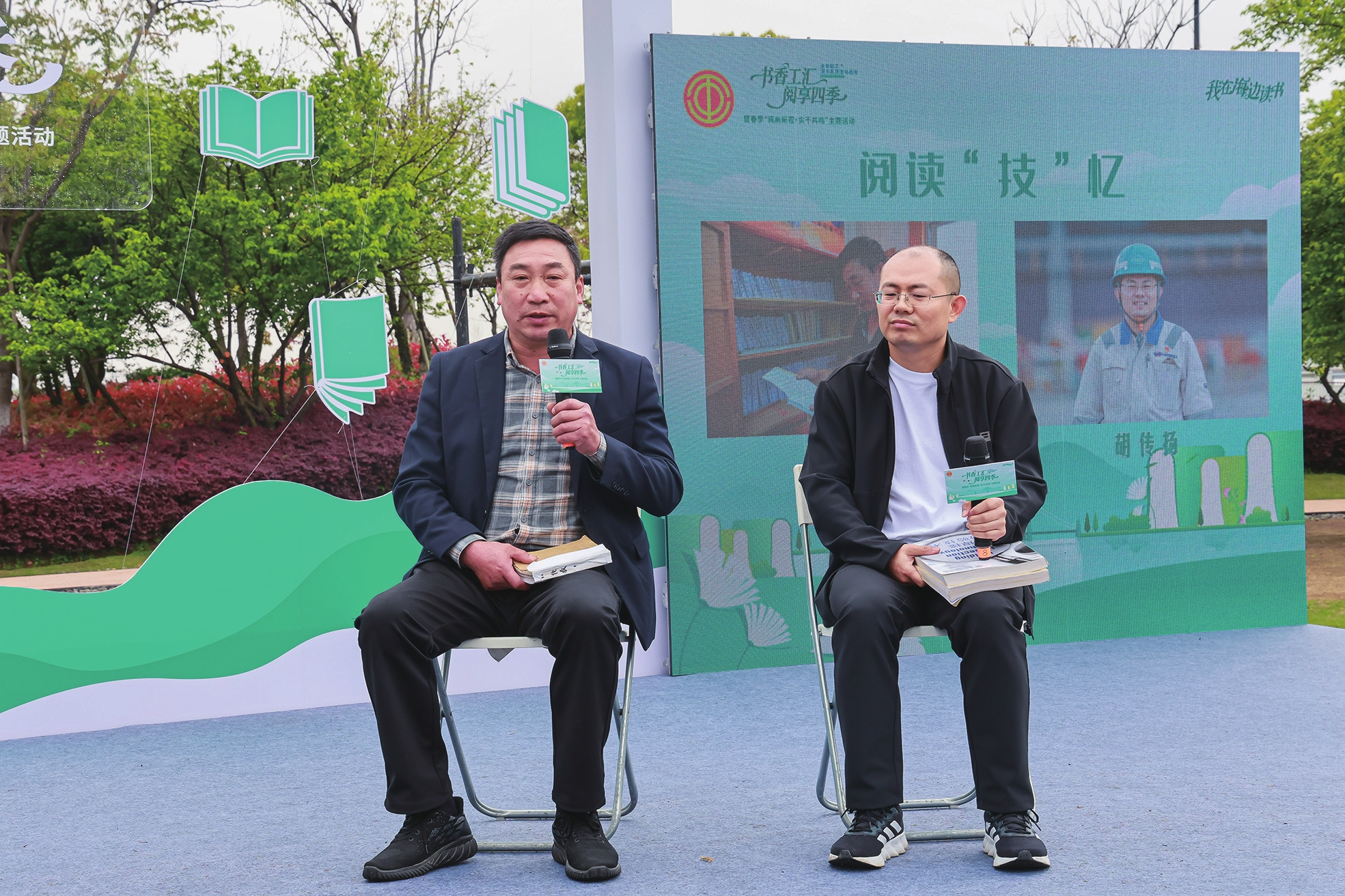 新城桥畔公园,全国劳动模范黄宽平(左)分享阅读心得 图/张磊