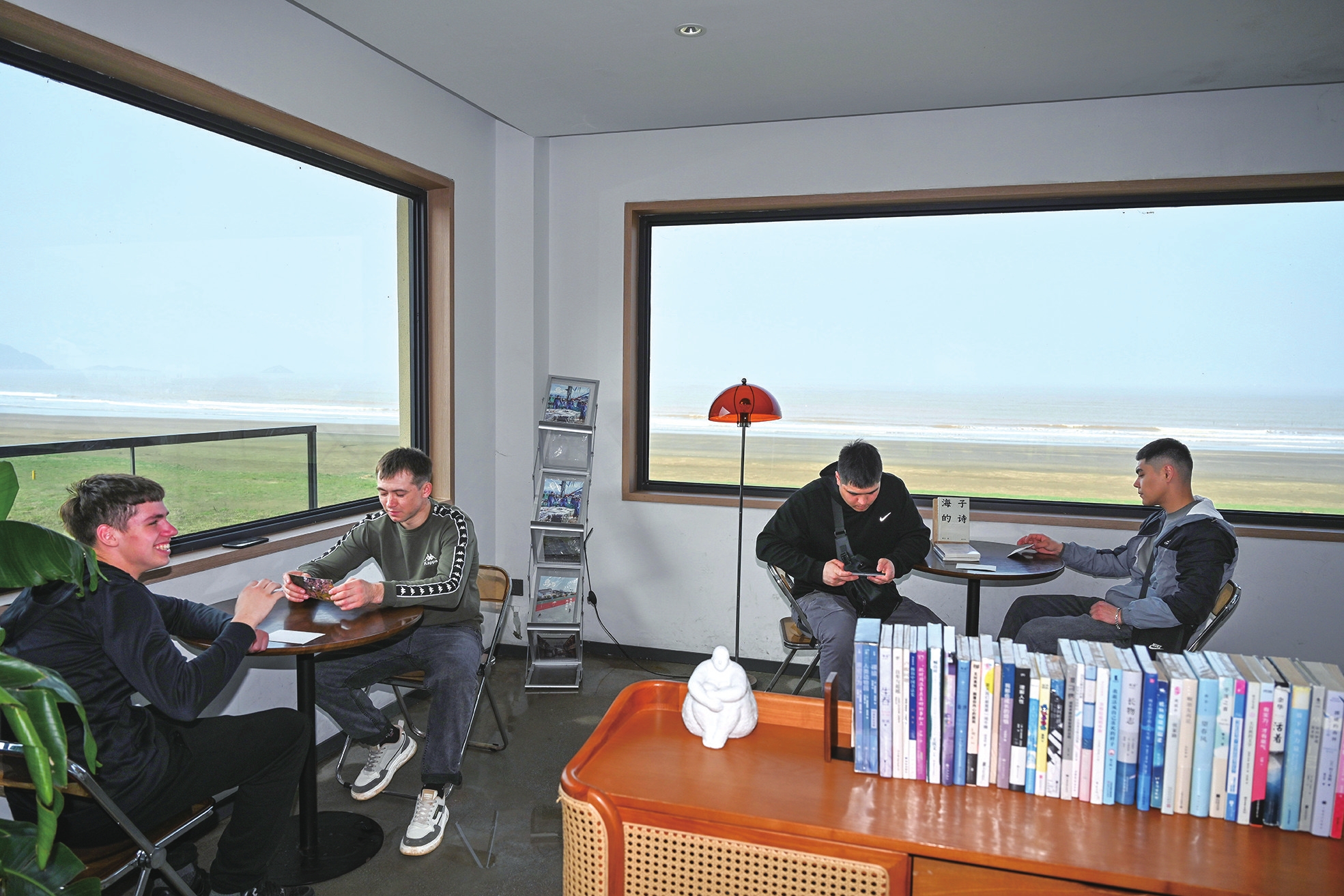 岱山东海郊野公园闻风书店,来自俄罗斯的海员在店内看书、写明信片 图/沈磊