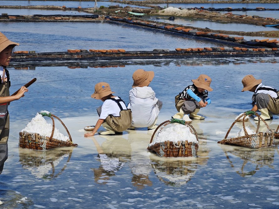 岱山自古“煮海为盐”,千年盐文化是海岛最独特的印记。春日的青黑盐场盐田波光粼粼,雪白盐花铺满滩涂。在这里,看海水经日晒风吹凝结成盐,感受“日晒雨淋、辛苦熬煎”的盐民生活。在老盐民的指引下,我们读懂了制盐的每一道工序,从纳潮、制卤到结晶、收盐,每一步都藏着先辈的生活智慧与坚韧担当。