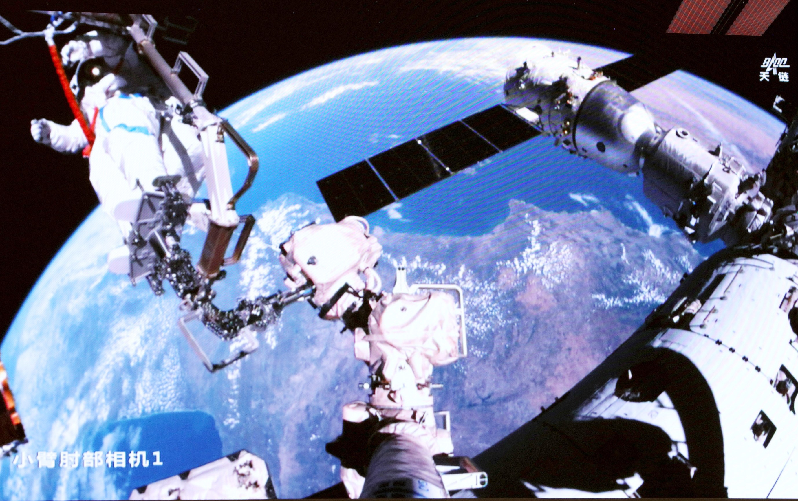这是2026年4月16日在北京航天飞行控制中心屏幕上拍摄的神舟二十一号乘组航天员武飞在舱外工作的画面 新华社 发(张帆 摄)