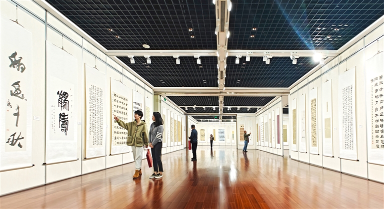 昨天,庆祝舟山市书法家协会成立40周年书法篆刻大展在市美术馆展出。本次展览展出作品共102件,涵盖篆、隶、楷、行、草书法五体。本次展览由市文联主办,市书法家协会承办,展出时间截至11月30日。记者 陈永建 摄