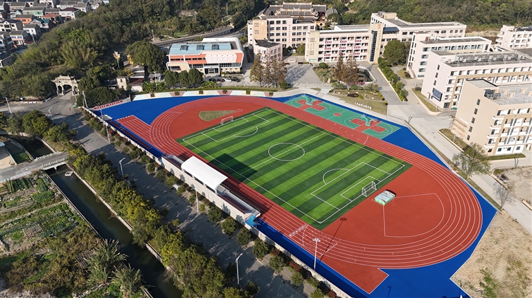 投资470万元的六横中学田径场提升收造工程,经过3个月的施工建设,目前投入使用。田径场总面积扩建到了12000平方米,跑道由原来的250米增加到了300米,田径场西侧专门建造了一个观礼台。航拍下的田径场红、蓝、白、绿颜色交相辉映,格外靓丽。 通讯员 刘生国 摄