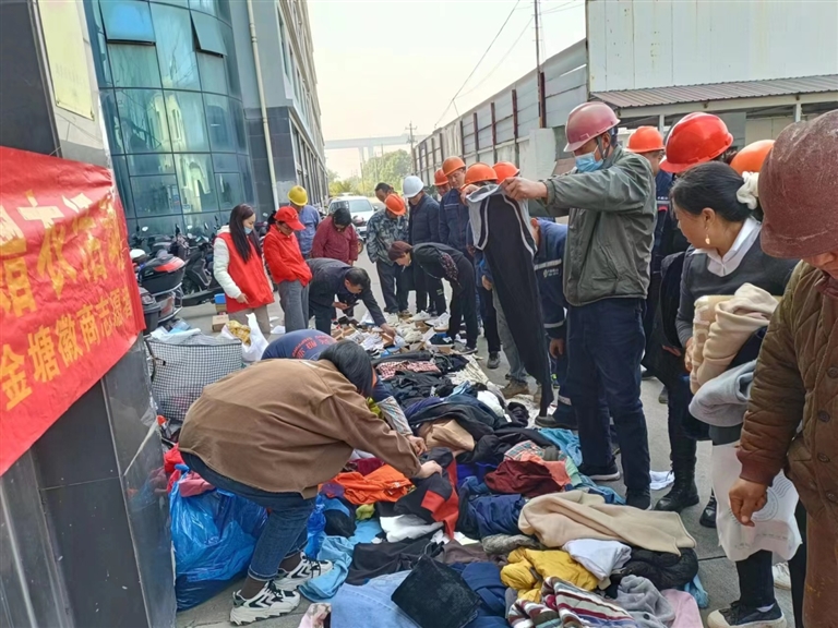 金塘徽商志愿者协会的志愿者也前往当地金舟船厂,为厂里的新居民送去1000多件棉衣和50双鞋子御寒保暖,将爱心接力下去。