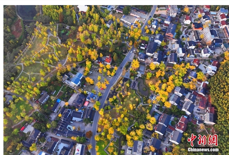 11月20日,随着秋去冬来,被誉为“世界银杏的故乡”的浙江省湖州市长兴县八都岕景区“十里古银杏长廊”满目金黄美如画,吸引各地游客纷至沓来,休闲游玩与赏景拍照。图为金灿灿的银杏与错落有致的民居相映成景(无人机照片)。中新网 图