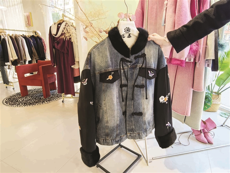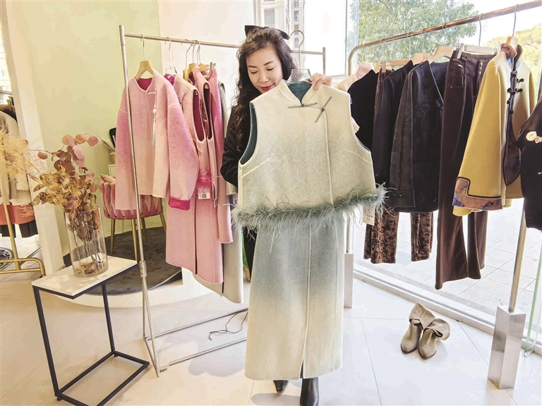 方娜展示了一套店内陈列的新中式服装,玉色渐变的呢子旗袍马甲套裙,马甲边缘还装饰了同色系的羽毛。整套服装虽然气质上国风满满,但在板型设计上又符合现代时装简约素雅的审美,羽毛的点缀则让服装多了一丝灵动活泼。“新中式服装因为工艺相对高,成本也会高一些。并且服装的面料质感很重要,如果面料质感差,做中式就会显得廉价,也撑不住一些比较跳脱的色彩。”
