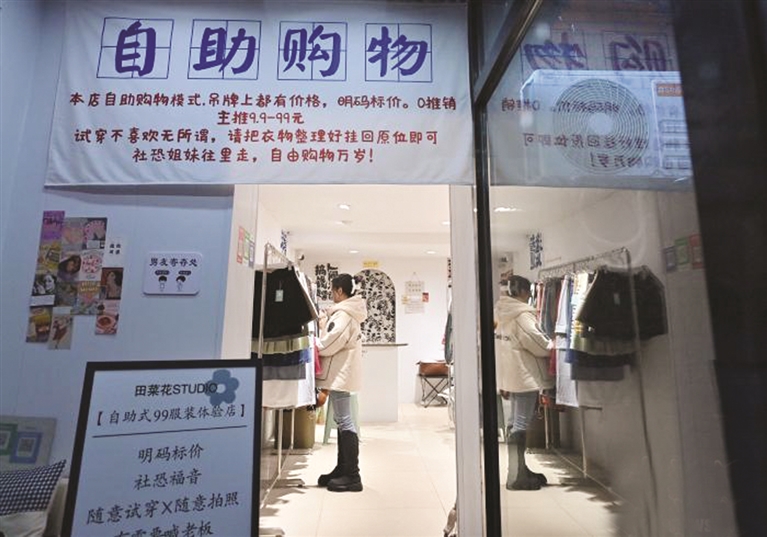 11月22日,吉林长春,一名女孩在自助式服装店试衣服。近来,长春市出现多家自助式服装店。店内没有售货员,服装明码标价,顾客通过线上预约进店选购。这种以诚信为基础的自由购物方式,受到很多年轻人的青睐。中新网 图