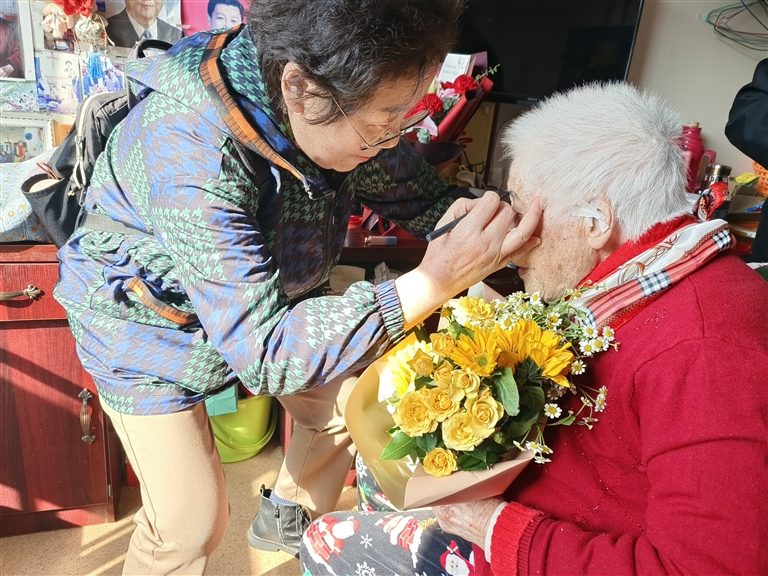 一大早,夏德懿老人就在子女们的张罗下开始精心打扮,从妆容、发型到服装,每个细节都不放过。“妈妈特别爱美,平常喜欢研究服饰搭配,只要有人来看望她,她一定要先化妆。”女儿刘京晶边为母亲描眉画口红,边和记者聊着母亲的趣事。