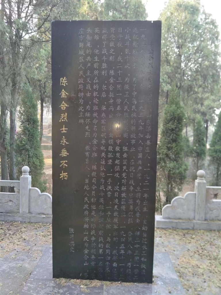 陈金合,1921年出生在山东滕县善庄的一个贫苦农民家庭,少年时代,父亲早逝。为了生计,他打过短工,当过小和尚,学过打铁。1939年,陈金合参加八路军,1940年加入中国共产党。他在历次战斗中,勇敢坚强,不畏艰险,冲锋在前,屡建战功。柏山战斗中,他舍身炸敌碉堡,献出了年仅24岁的生命。