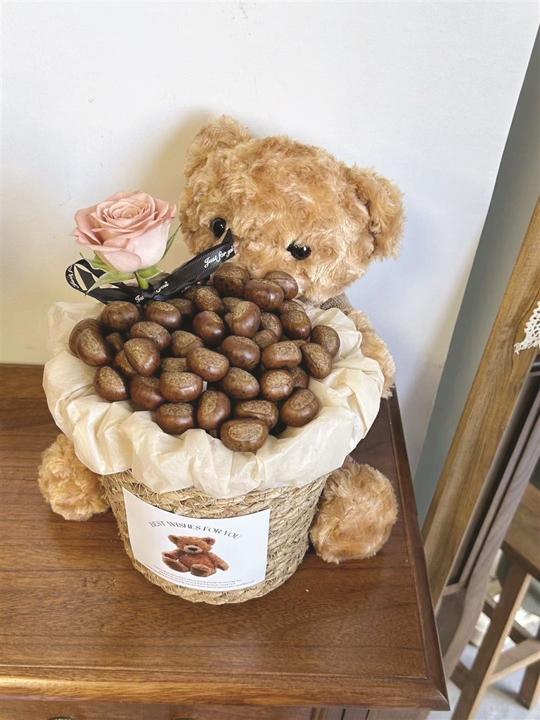“近年来大家对家居花卉要求越来越高,而且市场上流行的花束更迭速度太快。”楠星说,作为花艺师,不仅要具备一定创造美的能力,还要时刻关注市场上花束的流行元素。“现在的客人都会带图询价,问能不能做到1∶1还原,最近最流行的就是这个小熊桶,里面搭配的是糖炒栗子和‘卡布奇诺’玫瑰。”楠星说,就这个小熊桶,她们已经补过两次货了,非常受欢迎。喜欢这些款式的大多数是00后大学生。