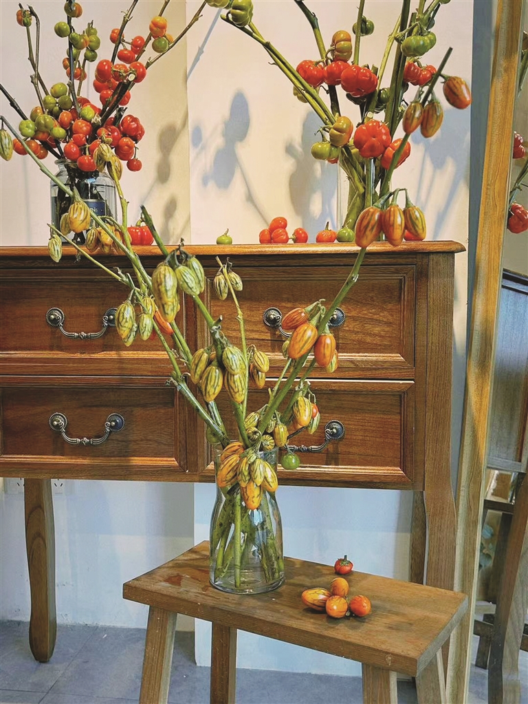小南瓜、柿子、茄子等陆续成熟的果实插瓶水养,有让人一饱眼福的观赏价值。岛城各个花店都在热推小南瓜切枝、番茄切枝、茄子切枝等各色果实鲜切枝。“小南瓜插在瓶中,比鲜花更有意境。”楠星说。