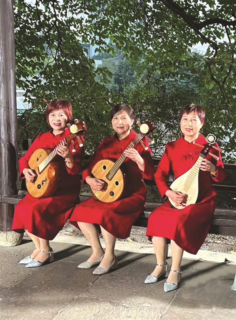 没有演出的时候,大家会一起去郊游,到天目山上搭天幕、喝茶、吹萨克斯。60多岁的团员们也追赶潮流,在社交平台上做直播,甚至也会接“商演”。三墩分团团长丁先生说:“吹一首曲子放在网上,能收到几百个点赞,可有成就感了。”