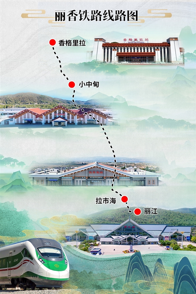 丽香铁路起于云南省丽江市玉龙纳西族自治县丽江站,终点是云南省迪庆藏族自治州香格里拉市香格里拉站,设计时速140公里,全长139公里,为中国国家Ⅰ级单线电气化铁路。通车后,两地最快1小时18分可达。